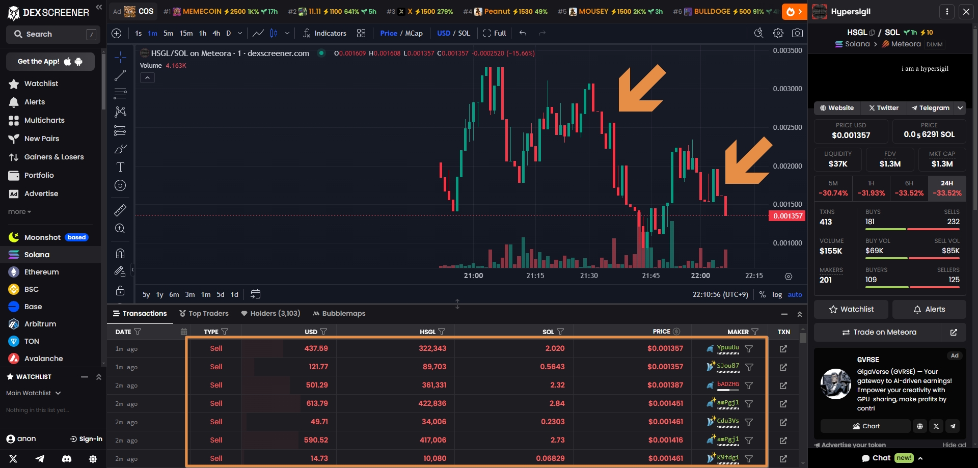 9. 상장된지 1시간 내라서 1H, 6H, 14H 상승 또는 하락 퍼센트가 동일하게 나옵니다. 그런데 벌써 수 천 퍼센트 상승도 있습니다. 목록 중 제일 위에 있는 HSGL/SOL "Hypersigil" 밈코인은 어떤 움직임을 보여주는지 클릭해서 보겠습니다.
