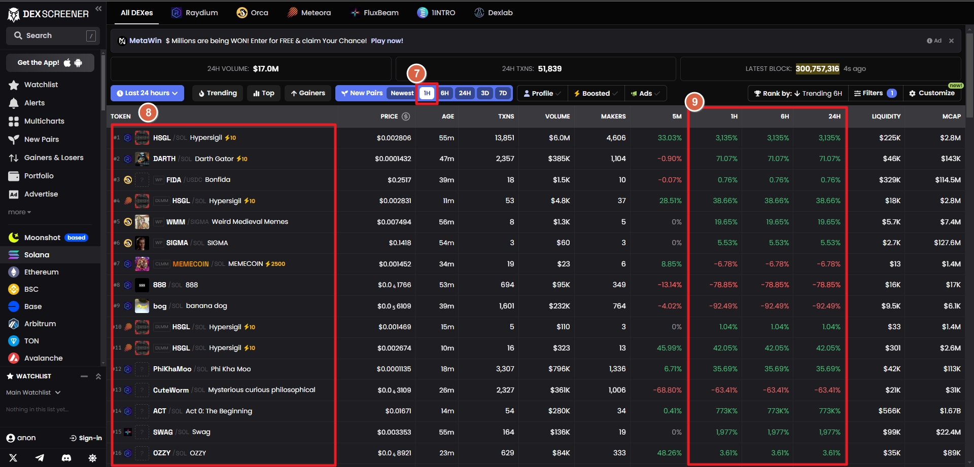 8. 1시간 안에 상장된 밈코인 목록이 나옵니다.
