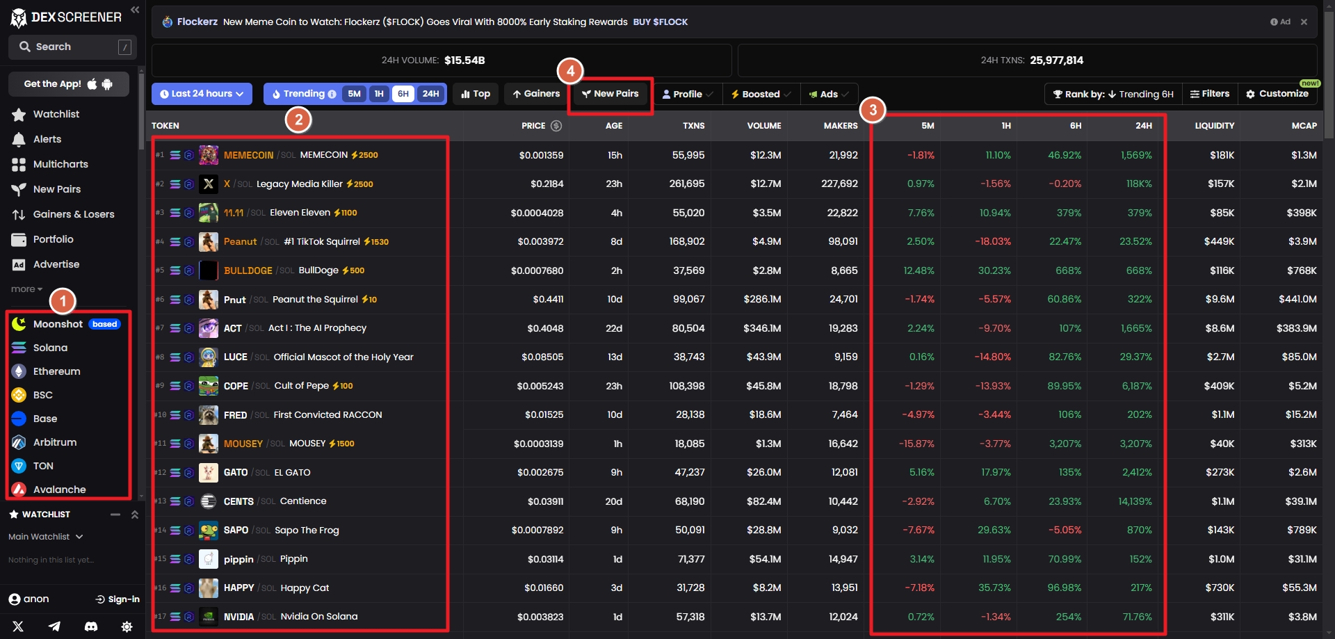 - DEX Screener에 접속하여 왼쪽 메뉴에서 관심 있는 블록체인을 선택합니다. 예를 들어 솔라나 또는 이더리움을 선택하면 해당 체인에 상장된 밈코인 목록이 나타납니다. 저는 많은 투자자에게 관심을 받는 솔라나를 메인 체인으로 선택했습니다.